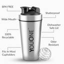 Youone Shaker Bottle For Protein Shake Gym Sipper Water Bottle Blender 750 ml Shaker 750 ml (1 का पैक, स्टील / क्रोम)