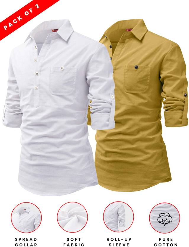 Elevate your style with the Yugnik Men's Beige with common white color Spread Collor Cotton Short Kurta. Suitable for any occasion, festival, or party celebration, this versatile kurta is a wardrobe essential.