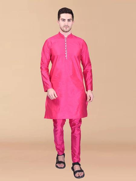 Yugnik Men Solid Cotton Blend Straight Kurta (Pink)