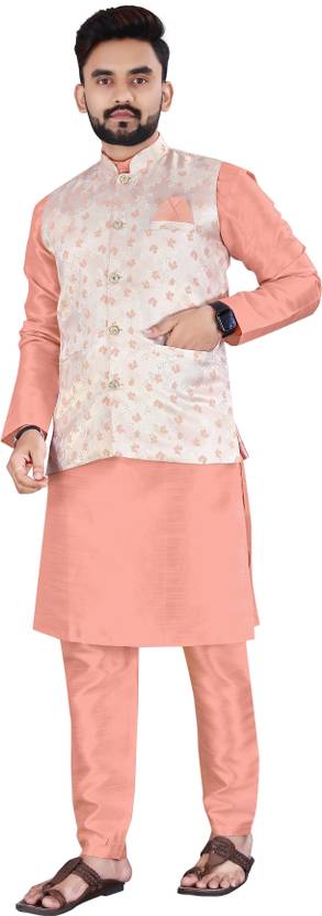 वेस्टकोट जैकेट सेट रेड पीस सेट के साथ इस लक्जरी ट्रेडिशनल इंडियन कुर्ता पायजामा में एक टॉप (कुर्ता) और एक बॉटम (पजामा) और नेहरू जैकेट शामिल हैं। बटन के चारों ओर सुंदर स्ट्रिंग है जो इस सेट में सुंदरता जोड़ता है। लूज़ फिटिंग स्लीव्स और साइड्स के साथ स्लिट्स एक आसान फिट के लिए अनुमति देते हैं और गारमेंट के माध्यम से हवा को स्वतंत्र रूप से प्रसारित करने देते हैं