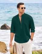 This men’s casual Henley shirt features a classic Mandarin collar with a partial button-down front placket. Designed in a solid black color, it exudes relaxed sophistication, perfect for beach outings or casual summer events. The shirt includes long sleeves with a roll-up style and is paired stylishly with light trousers for a breezy, minimal look.