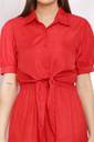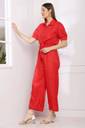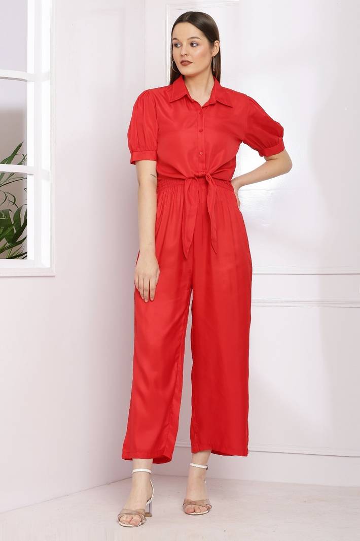 This vibrant mustard jumpsuit combines elegance and comfort for a chic, effortless look. The top features a collared shirt design with short, slightly puffed sleeves, giving it a smart, tailored appearance. The button-down front adds a classic touch, while the waist is defined by a fabric tie, accentuating the figure. The bottom half of the jumpsuit flows into wide-legged pants, offering ease of movement and a relaxed silhouette. The smocked detailing at the waist enhances the fit, making it both stylish and comfortable. Perfect for casual outings or semi-formal occasions, this jumpsuit blends sophistication with a bold color that stands out.