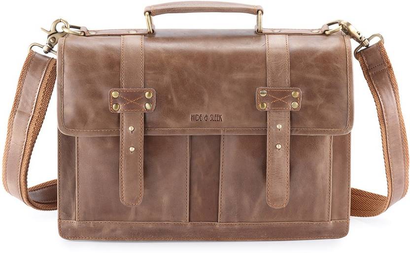 Satchel Briefcases with grab handles and detachable and adjustable shoulder strap. The classic satchel of the Venitor collection from Hide & Sleek is made of leather. This is a large enough bag to carry A4 files or 15" laptops plus lots of other things. This is a classic design in distressed finish leather. A well designed work bag. Fully lined and protective cushioning with embossed logo. The details of the bag: top carry handle, removable and adjustable strap, front half flap, tuck-tie fasteners with decorative buckles, main compartment, interior side pocket, interior credit card slots, mobile phone holder, pen slots, utility pocket and an exterior zipped pocket. It comes in its protective dust bag. All our products are handcrafted; there may be slight variations in appearance from the photo. Every effort is made to ensure that the photo is as accurate as possible. As leather is a natural product, items may have wrinkles, scars, scratches that are inherent characteristics and natural beauty of the hide.