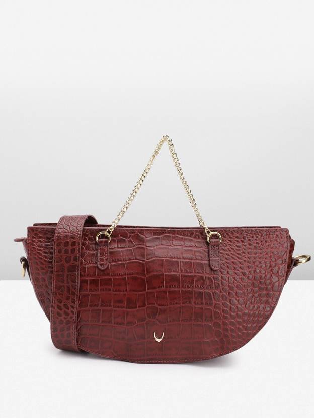 Maroon croc textured handheld bag 1 main compartment, has a zip closure, 1 inner pocket Tablet sleeve: no Two handles with a detachable sling strap Warranty: 1 year Warranty provided by brand owner/manufacturer