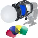Flash Light Accessories Kit Material: Magnet ABS Size of Honeycomb: 5mm Size of Diffuser: 95 mm Diameter PACKAGE: 4 x Color Filter (red, green, blue, yellow) 1 x Honeycomb Grid Reflector 1 x Diffuser Ball 1 x Flash Adapter Ring