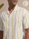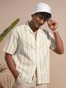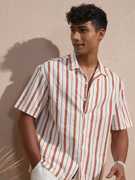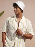 Highlander Men Cream Cotton Linen Printed Striped Cuban Collar Oversized Shirt