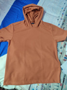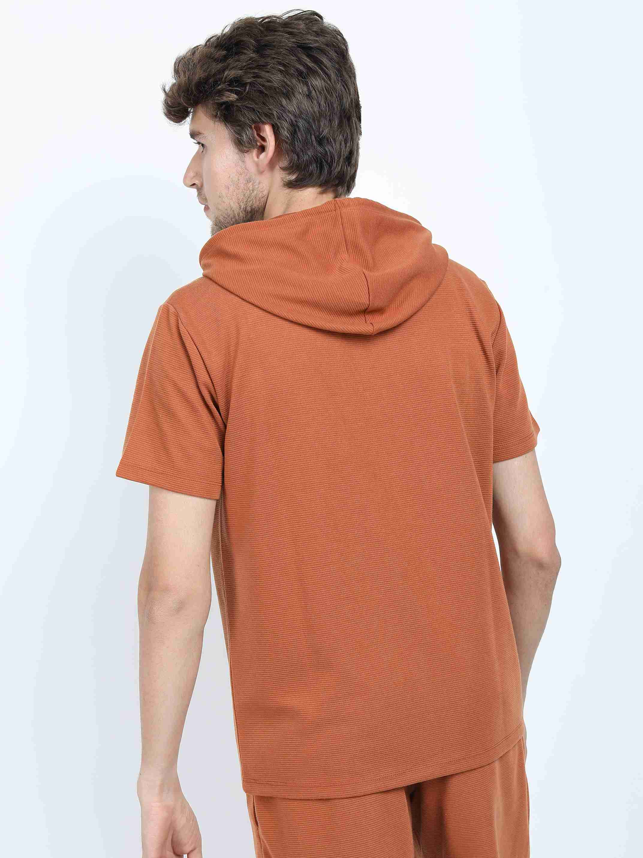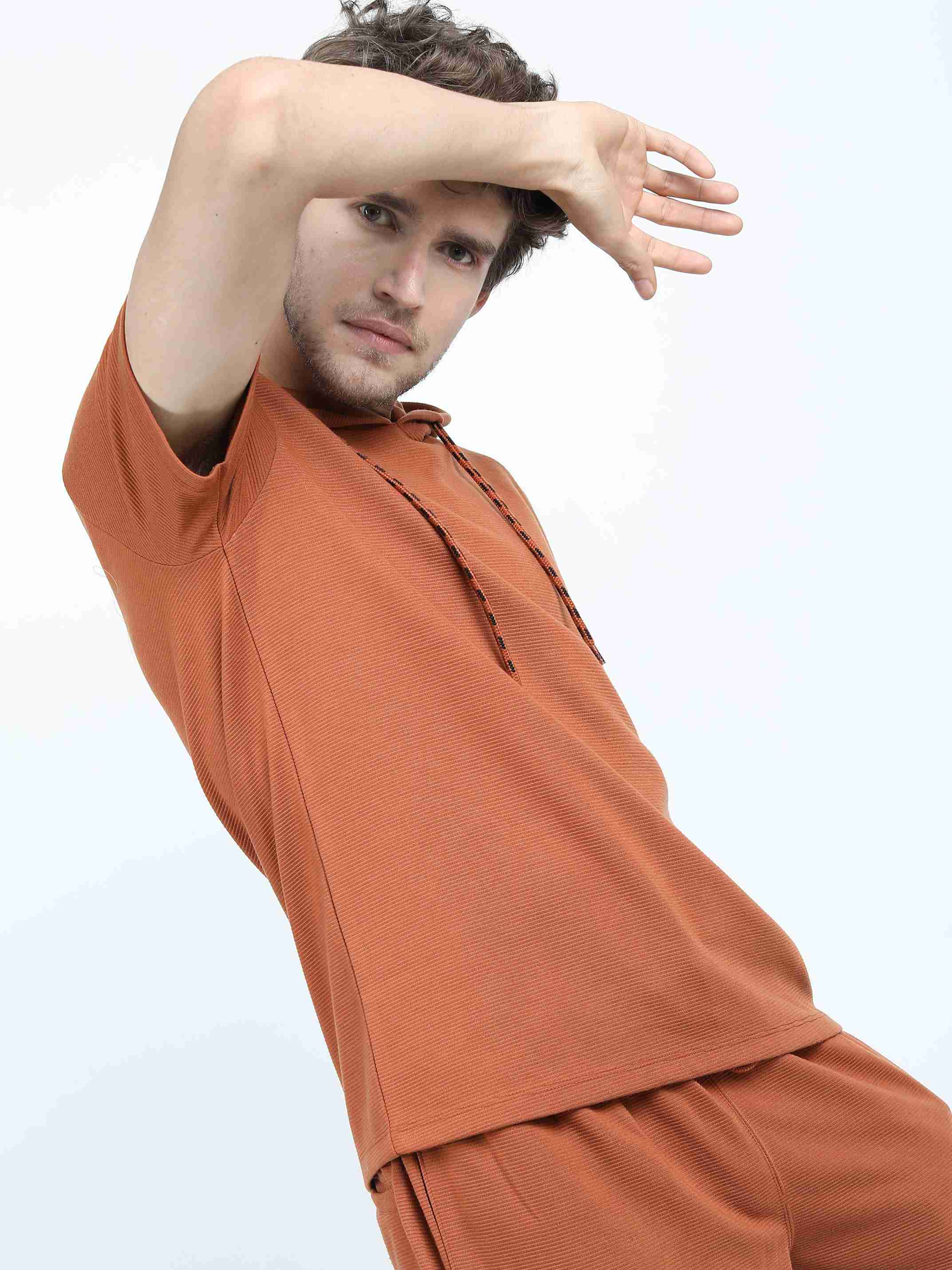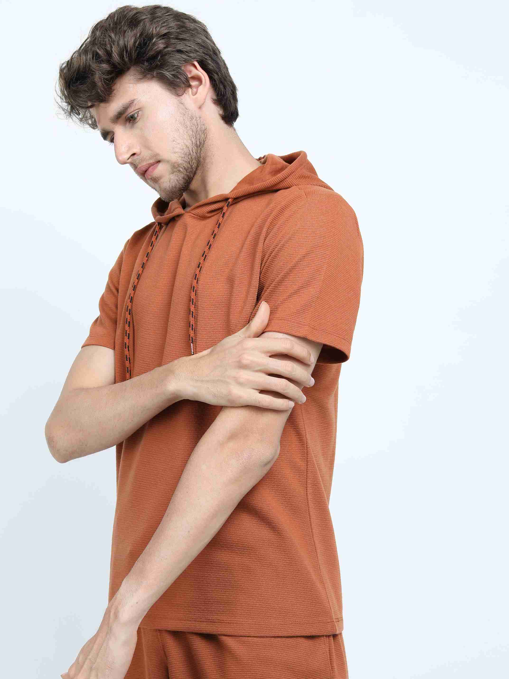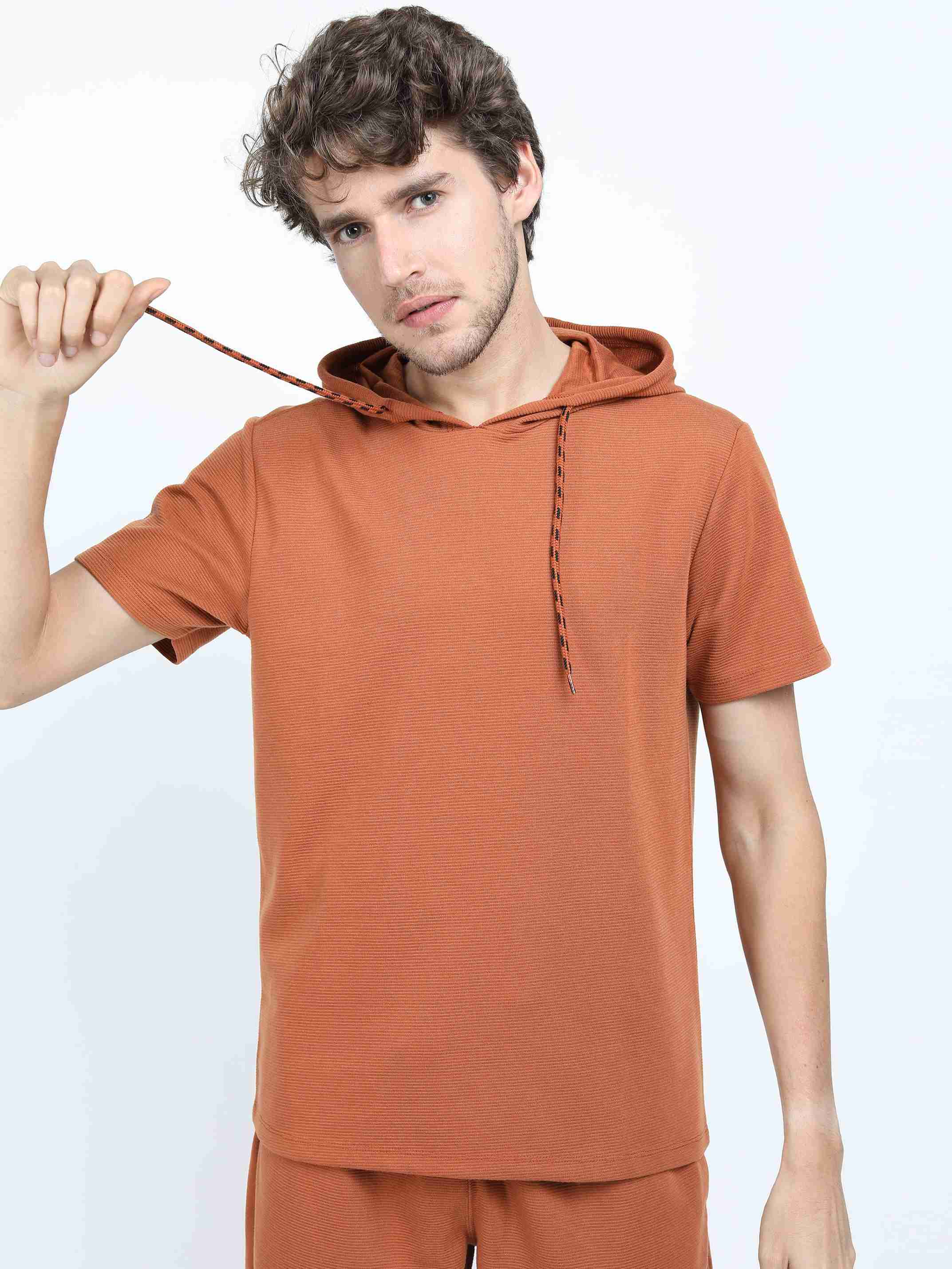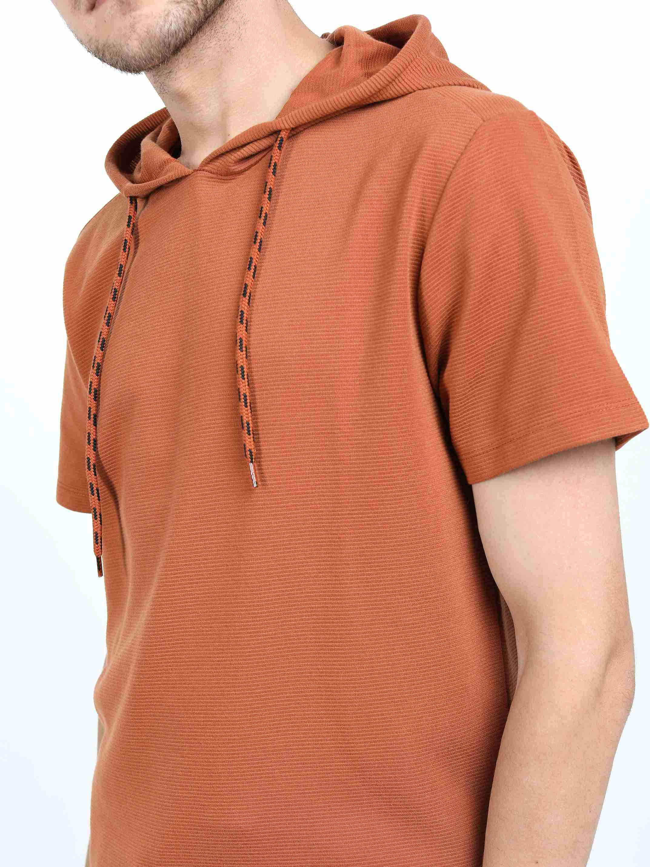 Men Solid Hooded Neck Cotton Blend Brown T-Shirt