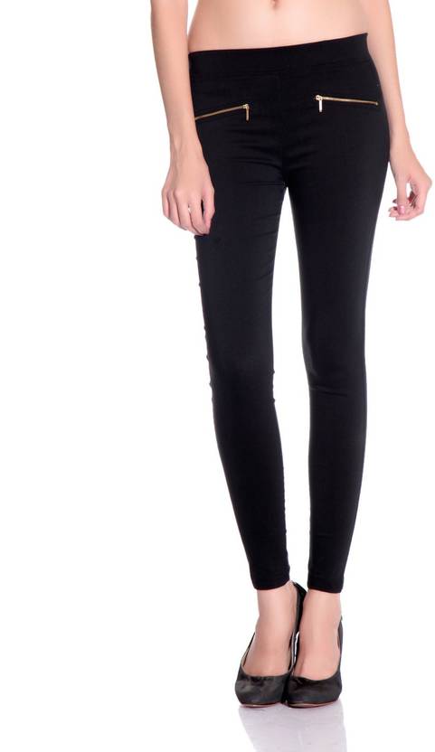 HIGHTIDE Women's Black Zipper Cotton Lycra Jeggings-Black