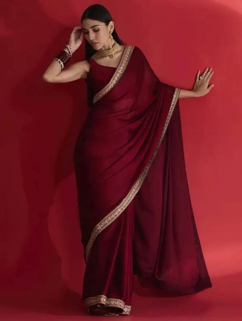 Make a lasting impression with this elegant chinon saree, designed for the modern woman who values tradition. Featuring a richly detailed golden embroidered border, this saree combines timeless craftsmanship with contemporary charm. Perfect for festive occasions, weddings, and parties, it ensures you look your graceful best wherever you go.