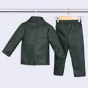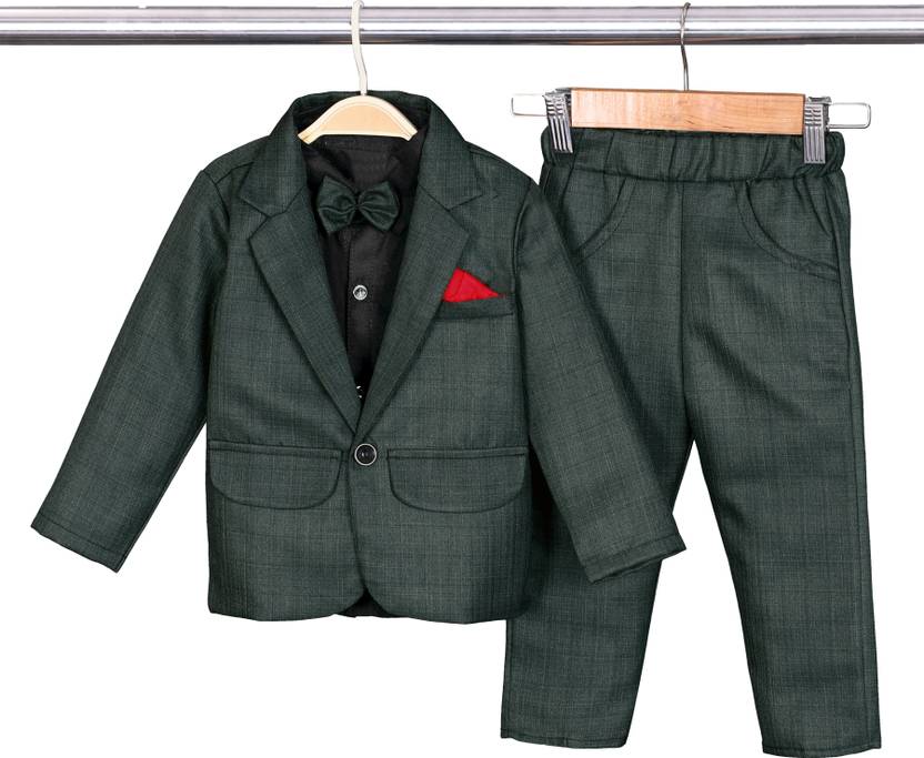 Formal wedding and party baby boys suit is a 3-piece set consisting Blazer(suit), pants and Black shirt. The coat in this kids' suit has a standard notch lapel adorned in shimmering motifs.It comes with a bow tie and relaxed Pull on pants . This suit for boys is available in Three colour options: Blue , Gray and Dark Green.Made from Polyseter Fabric, this boys clothes comprises of a full sleeve Blazer will make your little one look ready for an ethnic .Party ,Wedding ,New year ,Shool Function and Festival.