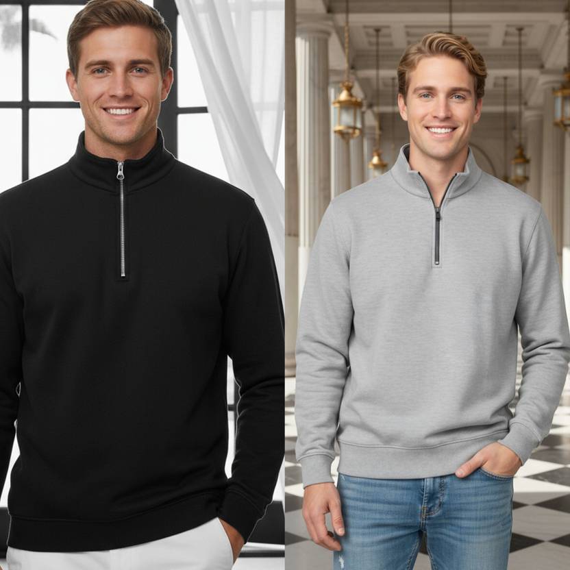 Elevate your wardrobe with this Stylish 2Pcs Combo High Neck Men's Sweatshirt, crafted from premium cotton fleece for unbeatable comfort and warmth. Featuring a sleek half-zip design, this sweatshirt effortlessly blends functionality with contemporary style.