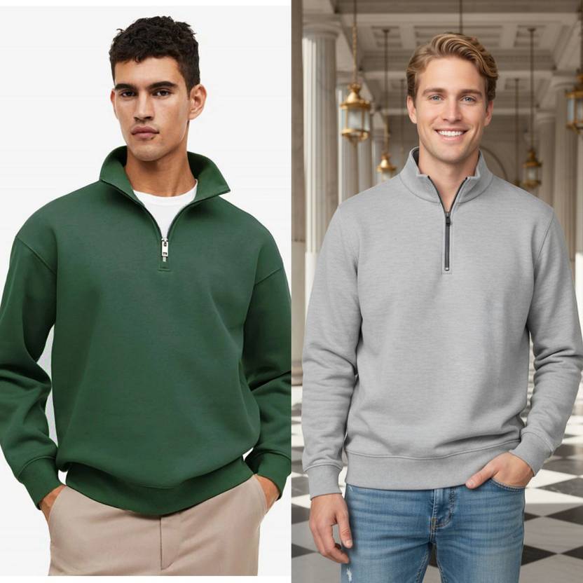 Elevate your wardrobe with this Stylish 2Pcs Combo High Neck Men's Sweatshirt, crafted from premium cotton fleece for unbeatable comfort and warmth. Featuring a sleek half-zip design, this sweatshirt effortlessly blends functionality with contemporary style.