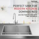 You can complete your daily kitchen tasks with ease with the Hindware Domingo Neo Handmade Kitchen Sink. Crafted from thick and sturdy stainless steel sheets that are manually joined to form a rectangular shape, this sink is designed to withstand daily use. Its use of high-quality 304-grade steel, containing up to 18% chromium and 8% nickel, ensures exceptional robustness and durability. Additionally, this sink's tight radius corners offer ample usable space, making daily kitchen tasks effortless.