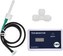 | Key Features | - Range: 0-9990 ppm: (0 – 999 ppm the resolution is 1 ppm. From 1000 to 9990 ppm, the resolution is 10 ppm, indicated by a blinking ‘x10’ image.), Accuracy: ±2%, Conversion Factor: NaCl (avg. 0.5), Cable Length: 24.5? (including sensor), Fittings: 1/4? standard, also available with 3/8? or 1/2?, Power source: 2 x 1.5V button cell batteries (LR44 or equivalent; included), Battery life: approx. 1000 hours of continuous use, Size: 7.6 x 2 x 4.7 cm (3 x .8 x 1.9 in.), Weight: 79.4 g (2.8 oz.), Installs quickly and easily, Also available without T-fitting (Model Name: SM-1WOF), Factory Calibrated: our meters are calibrated with a 342 ppm NaCl solution. Meters can be recalibrated with a mini-screwdriver., Auto-Off function conserves battery power. (Shuts off automatically after 10 minutes of non-use), Efficient and accurate, Displays TDS level of a single water line