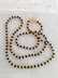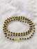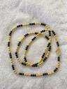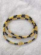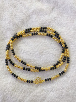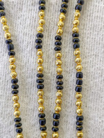 The chain features a distinctive design with alternating groups of three glossy dark beads followed by three metal beads. This alternating pattern creates a visually appealing contrast, adding a touch of elegance and uniqueness to the chain. The glossy dark beads complement the metal beads, enhancing the overall aesthetic appeal and making it a versatile accessory that can be paired with various outfits for different occasions.