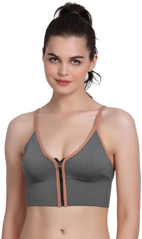 Women lightly removable padded sports front zipper bra.