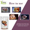 | Usage Instructions | - Real Taste & Aroma – Holy Natural Fig Powder is No added sugar, color, flavour or preservative used, even then all real characteristics, aroma, taste are intact. Rich in taste. 100% Pure & Natural, Vegan, Gluten free., Weight management - figs are a good source of fiber, in weight management as high-fiber foods have a positive impact., How to use: Fig Powder can be used to make pies, pudding, cakes, other bakery products, jams, jellies, etc., It can also be used in desserts such as muffing, bars, porridge, oatmeal or breakfast cereals.