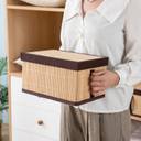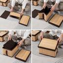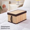 Made of natural bamboo and reinforced with heavy-duty bottom board. The pull handle on the front make it easy to pull the box off of a shelf. Storage boxes with lid, prevents dust to reach your storage items. Folds flat for compact storage when not in use. Can be used as shelf baskets for organizing and storing clothes, baby products, pet products, toiletry storage and many other uses. These storage organizer box measures 25x20x15 cm. Package content 1 storage box for clothes.