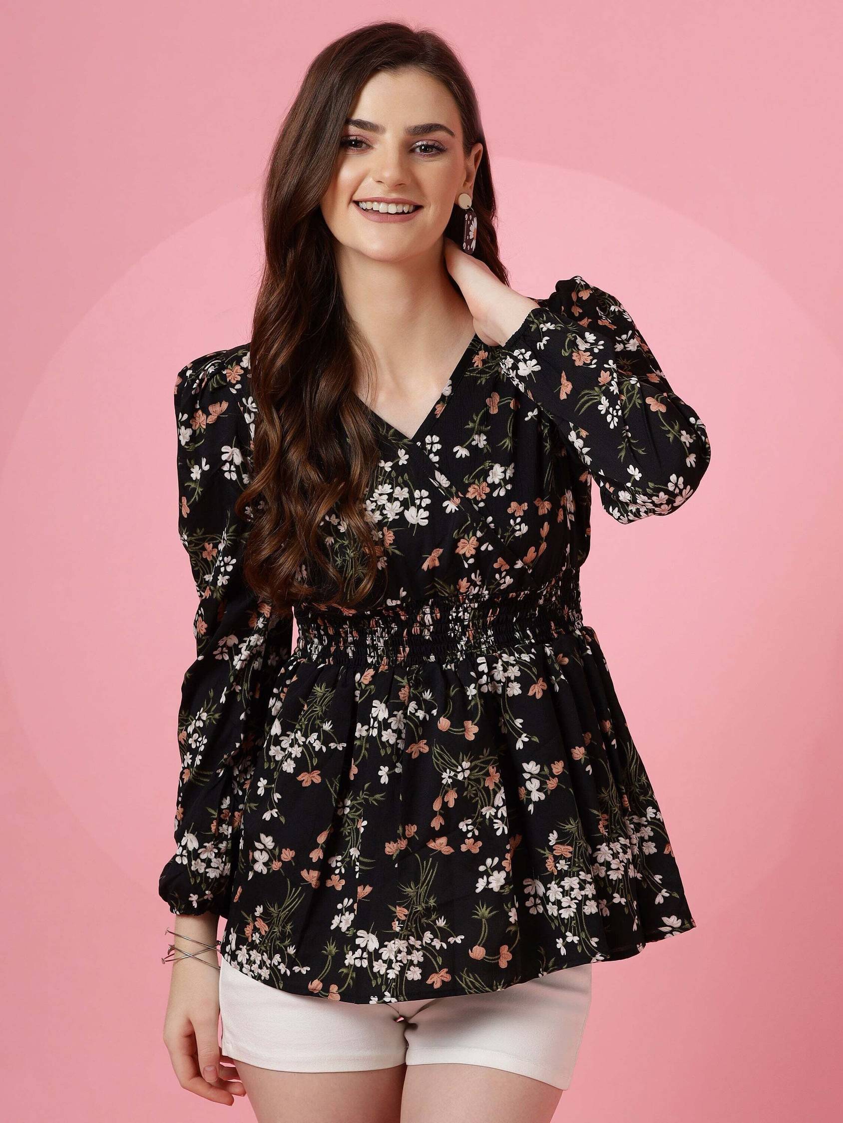 Honky Tonky Casual Floral Print Women Black Top