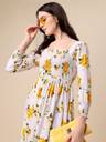Easy and elegant, Floral print this skater dress to give your closet an effortless sartorial update. Tailored in a swiss dotted fabric, the dress features a smocking detail and ruffles along the hem .it come with long puff sleeves. Style Tip: Complete the look with heels and a ting sling.
