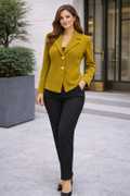 Upgrade your professional wardrobe with this Women’s Tailored Blazer Jacket, designed for a polished and confident look. Crafted with a classic single-breasted, two-button design, this blazer delivers a flattering fit that enhances your silhouette while remaining comfortable for all-day wear. The structured lapel collar and long sleeves create a timeless business-ready style suitable for office, meetings, interviews, and formal occasions. Made from a soft, durable fabric blend, this women’s blazer offers a smooth finish with excellent shape retention. The tailored seams and functional front pockets add both style and practicality, making it easy to pair with dress pants, skirts, or jeans. The elegant mustard green color adds a modern touch, perfect for business casual or smart casual outfits. Whether you’re heading to work, attending a conference, or styling a chic everyday look, this women’s suit jacket is a versatile essential that transitions effortlessly from professional to casual settings.