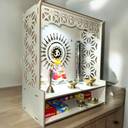 Mandir designed for corner space of the wall, A graceful pooja mandir for home or office will definitely uplift the positive vibrations Contemporary design of mandir for home wall mounted and craftsmanship in teak texture will always be talked about Package includes 2 Watt Spot Light LED fixture which can be directly connected to power supply does not require convertors/ drivers. This spacious puja mandir for home/Office has lot of space for Idols, figurines, bells and diyas, agarbattis etc. The mandir can be kept on table or can be wall mounted on corner spaces You can best use pooja stand for home decor, Wall temple, table top temple, Pooja Room, Mandir, Living Room decor, Temple Wall, etc to enhance the look of the room, organize & utilize space. Its great for Ganapati decoration or Ganesh Makhar Package Contains Wooden Temple with easy assembling instruction. Yes it will not take more than a minute. We also provide the screw with packing material to mount it on the wall. Specifications