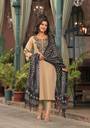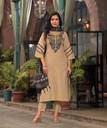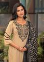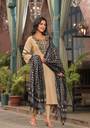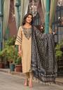 The set is paired with matching beige pants for a cohesive look, while the standout feature is the printed khadi silk dupatta. The dupatta, with its intricate prints and soft khadi silk texture, brings a vibrant yet traditional element to the outfit, elevating the overall aesthetic.