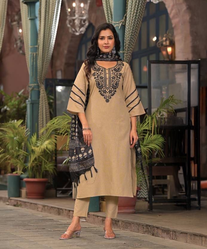 The Hope Women Beige Cotton Blend Kurta Pant Set offers a perfect blend of simplicity and elegance. The kurta, crafted from a soft cotton blend fabric in a soothing beige hue, provides a comfortable yet stylish fit, making it suitable for both casual and semi-formal occasions. The neckline is accented with delicate black crochet lace, adding a refined touch of contrast and sophistication.