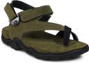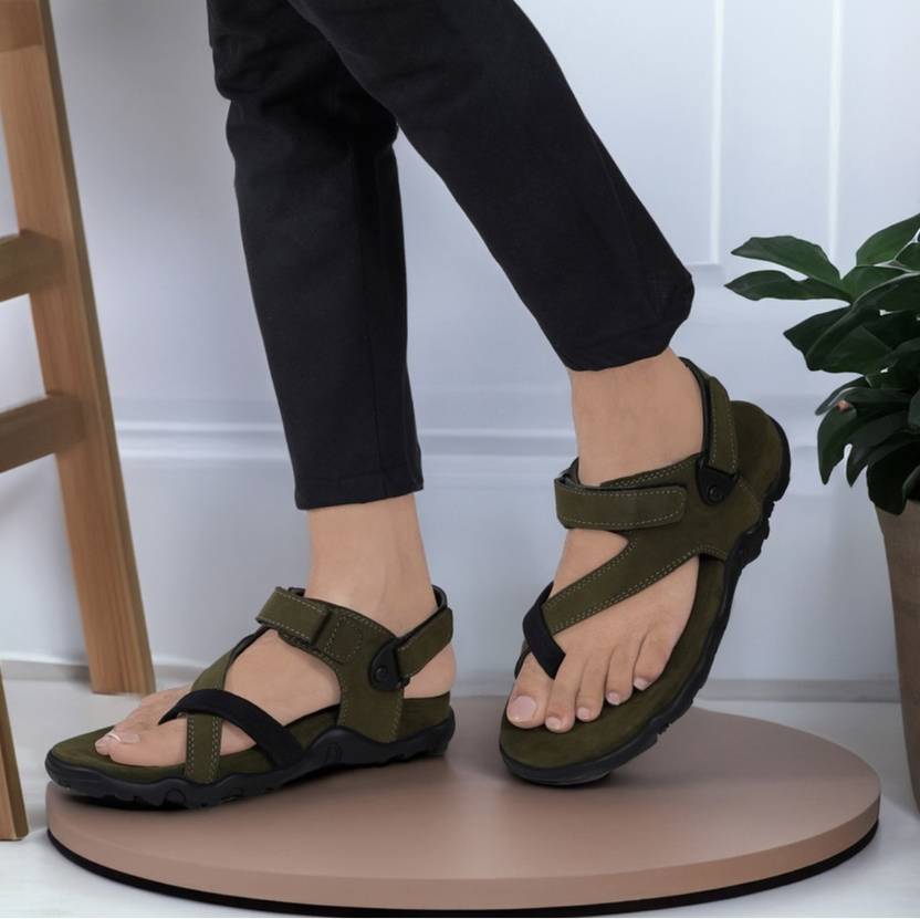 This product is a olive sandal designed for casual or outdoor wear, featuring an open-toe construction with a toe loop and supportive straps secured by velcro closures and a side button attachment. The sandal combines functional comfort with a rugged sole suitable for varied terrains, and visible contrasting stitching adds both durability and visual appeal. This men's sandal is crafted from olive suede material, featuring a unique toe loop and double-strap design for enhanced grip and support. The sandal sports a sturdy rubber outsole with textured grip, making it ideal for both everyday casual use and light outdoor activities. Adjustable velcro straps allow for a custom fit around the ankle and instep, while the cushioned footbed provides all-day comfort.