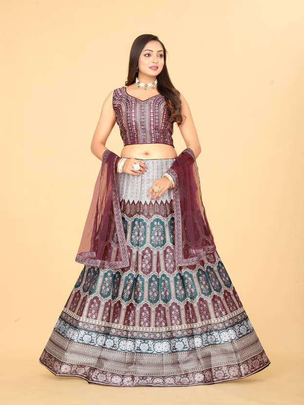 The lehenga features a graceful flare with detailed embroidery, sequins, or mirror work that catches the light with every step. Paired with a fitted choli (blouse), this outfit hugs in all the right places and ensures all-day comfort. The look is completed with a matching dupatta, designed with fine borders and rich detailing to elevate your ethnic style.