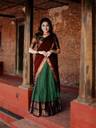 Add a touch of elegance to your festive wardrobe with this Designer Unstitched Lehenga Choli Set, featuring a bottle green lehenga, maroon dupatta, and navy blouse fabric with zari borders. The rich contrast of maroon and green with golden woven design makes this outfit perfect for weddings, festive occasions, cultural events, and parties.