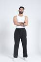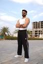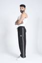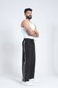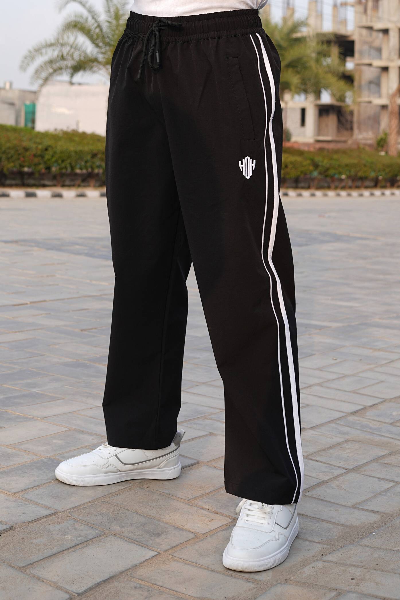 Black Stridex Loose Fit Track Pants with White sporty side stripe. Designed to balance gym functionality with streetwear flair, these pants feature a relaxed silhouette for all-day comfort and effortless style. Made from a premium wrinkle-free nylon-spandex blend, they provide dry-fit performance while keeping you comfortable during workouts or casual outings. Includes an elasticated waistband with drawstring closure, two YKK zippered side pockets, and one back pocket for everyday convenience.