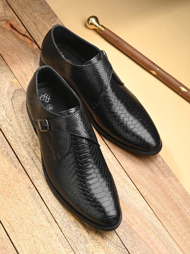 House of Pataudi Men's Black Faux Leather Formal Slip On Monk