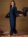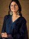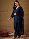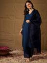 Elevate your ethnic wardrobe with this gracefully crafted three-piece set, designed to bring a touch of sophistication to every festive occasion. The kurta and bottom are fashioned from a luxurious silk blend that offers a rich texture and fluid drape, giving the ensemble a polished and elegant appearance. Delicate lace detailing at the neckline, sleeves, and hemline adds a refined charm, while the organza dupatta, with its embroidered floral borders, enhances the overall grace of the outfit. The thoughtful combination of fabrics ensures comfort without compromising on style, making it perfect for long celebratory gatherings. Whether you're attending Diwali parties, Eid festivities, Raksha Bandhan ceremonies, Karwa Chauth pujas, Bhai Dooj rituals, or even family wedding functions and Sangeet nights, this ensemble will make you stand out effortlessly. Its timeless aesthetic is suited for both traditional settings and contemporary events, ensuring you make a memorable impression with every step.