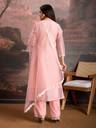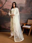 This exquisite white kurta set is a vision of elegance and sophistication, perfect for festive occasions, weddings, or any celebration where you want to make a lasting impression. The kurta, crafted from a luxurious Chanderi cotton blend, exudes a timeless charm with its pristine white hue and delicate thread embroidery. The intricate embroidery, meticulously crafted, adorns the kurta, adding a touch of traditional artistry and sophistication. The classic round neck complements the overall design, while the lightweight and breathable Chanderi fabric ensures comfort throughout the day or evening. Paired with the kurta are comfortable and chic silk crepe trousers, offering a smooth and luxurious feel against the skin. The trousers provide a perfect balance of style and comfort, allowing for ease of movement while maintaining a polished and refined look. Completing this stunning ensemble is a delicate net dupatta, adding a touch of ethereal grace and femininity. The dupatta features an all-over lace border, further enhancing its beauty and complementing the intricate embroidery of the kurta.