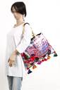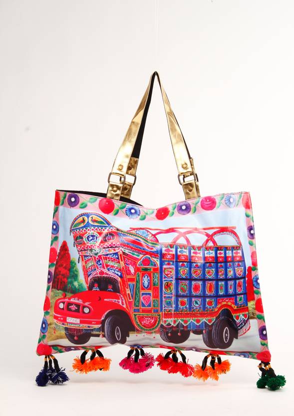 Printed flex tote with pu handle embelished with decorative tassles. It has got one mobile pocket and 1 coin pocket.
