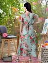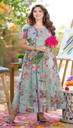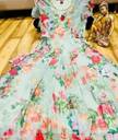 This gown is a Ankle-length piece with a light mint green base, adorned with vibrant floral prints in shades of pink, peach, and green. It features a round neckline and flutter sleeves, adding a touch of femininity and grace. The outer layer is made of lightweight Georgette, providing a soft, flowy texture, while the inner layer is Crepe, ensuring comfort and a flattering silhouette. The gown is designed in a flowing A-line style, perfect for a variety of occasions where elegance and ease are desired.