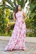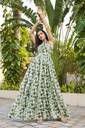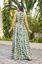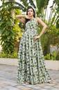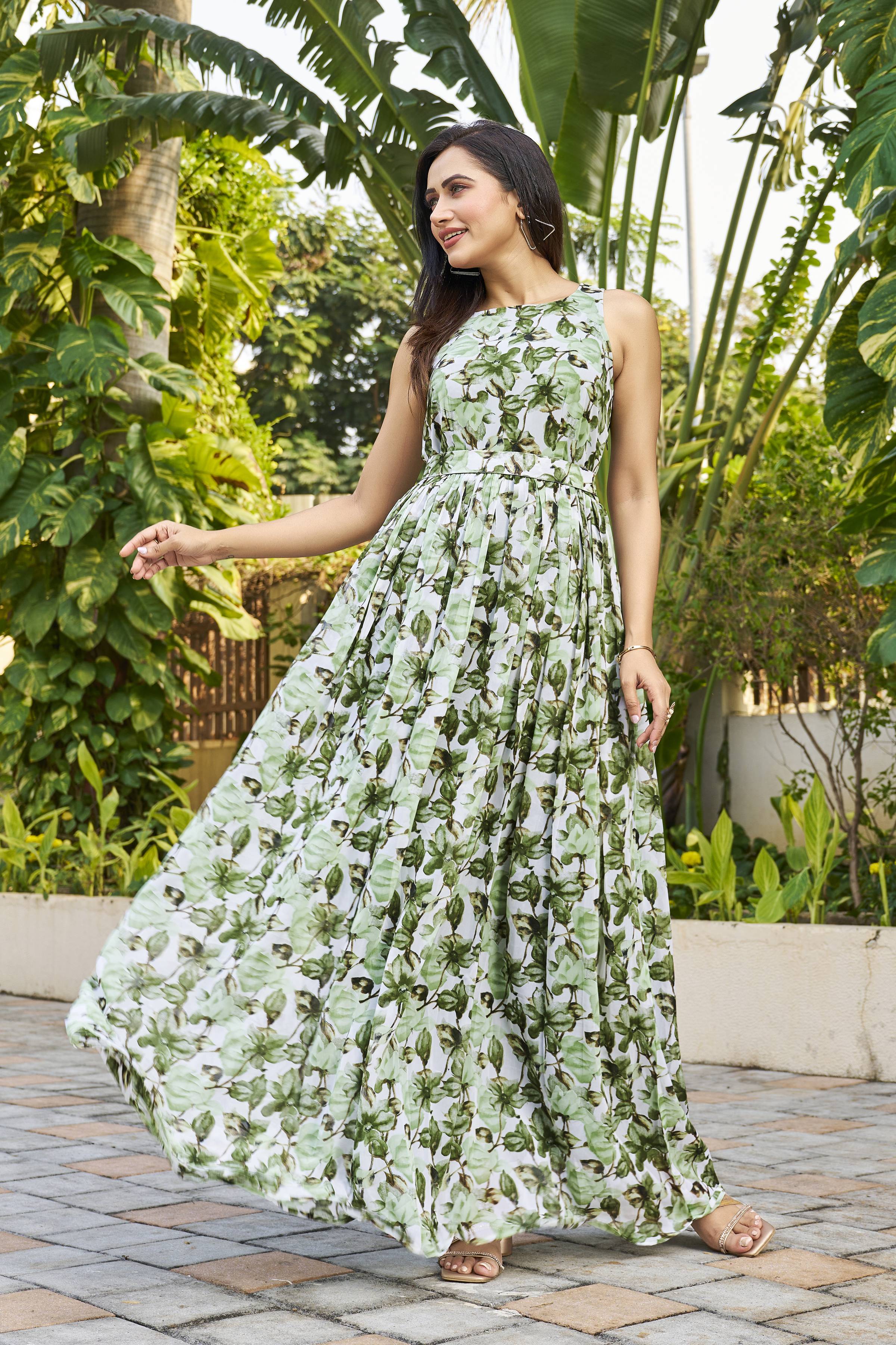 This exquisite gown features a graceful boat neck design that beautifully accentuates the neckline and shoulders, offering an air of elegance and sophistication. Crafted from lightweight georgette fabric, the gown drapes effortlessly, allowing for fluid movement and a comfortable fit. The lush green color evokes a sense of tranquility, while the delicate floral prints scattered throughout add a touch of freshness and vibrancy. With its sleeveless design, this maxi length gown is perfect for warm weather events, making it an ideal choice for garden parties, weddings, or evening soirees. Pair it with statement earrings and strappy heels to complete a stunning ensemble that embodies both style and grace.