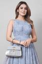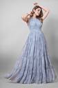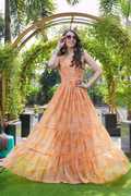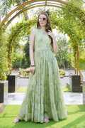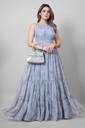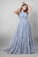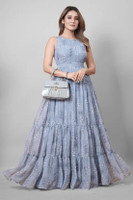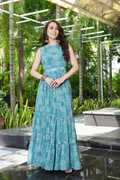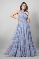 Boasting georgette material with crepe lining, this gown offers lightweight comfort and a smooth feel. The georgette fabric drapes beautifully, highlighting the flared layers, while the crepe lining provides softness against the skin and good coverage. Consequently, this gown delivers both comfort and style, making it suitable for extended wear.