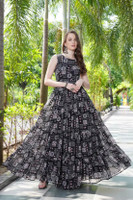 Boasting soft georgette material, this gown drapes smoothly and feels light against the skin. The fabric allows easy movement while maintaining the shape of the flared silhouette. As a result, this gown remains pleasant to wear while keeping a refined and flowing appearance.