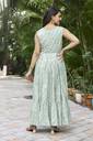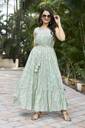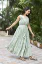 dive into an enchanting world of glamour with our Women's flaired dress in luxurious silk blend, boasting a round neck, printed, and a sleeveless. this dress is a captivating blend of sophistication and modern allure, designed for the woman who appreciates the artistry of fashion. crafted from high-quality silk blend, the dress offers a sumptuous and graceful drape that effortlessly accentuates your silhouette. the round neck design adds a touch of contemporary chic, showcasing your shoulders and neck elegantly. this neckline is both stylish and timeless, making it an ideal choice for those who want to make a bold yet classic statement. the sleeveless design enhances the dress's versatility, allowing you to embrace warmer weather or showcase your favorite accessories. the Midi length exudes elegance, creating a dramatic and enchanting effect that makes this dress perfect for formal events, evening galas, or any special occasion where you want to make a lasting impression. in summary, the Women's flaired dress with a round neck, printed, and sleeveless design is a testament to contemporary glamour and timeless sophistication. with its exquisite design, quality silk blend fabric, and thoughtful details, this dress is a standout piece that transforms any event into a moment of allure and grace, making you the epitome of modern elegance.