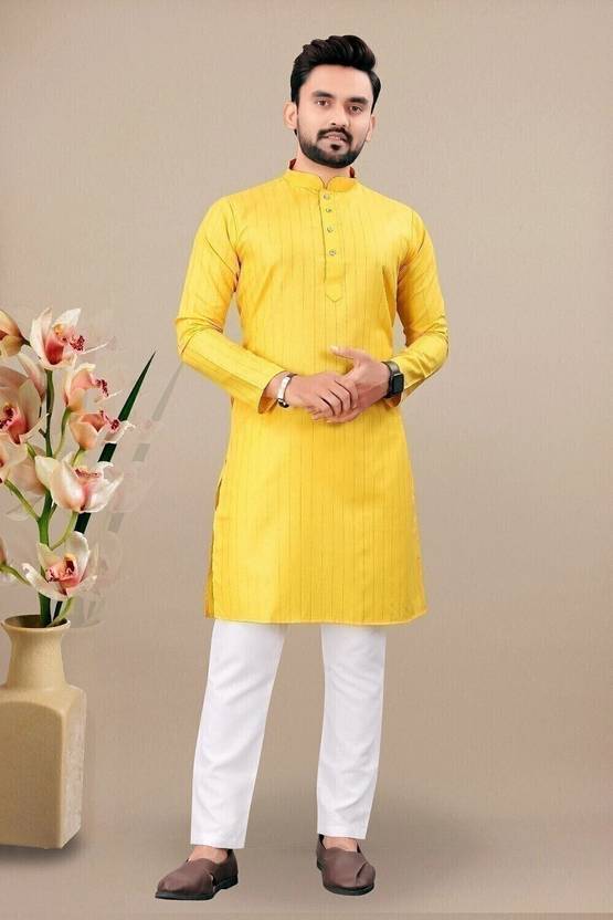 Look your ethnic best wearing this coloured kurta pyjama set. Made from Cotton regular-fit kurta pyjama set comprises a full-sleeved kurta and pyjama to complete your look.