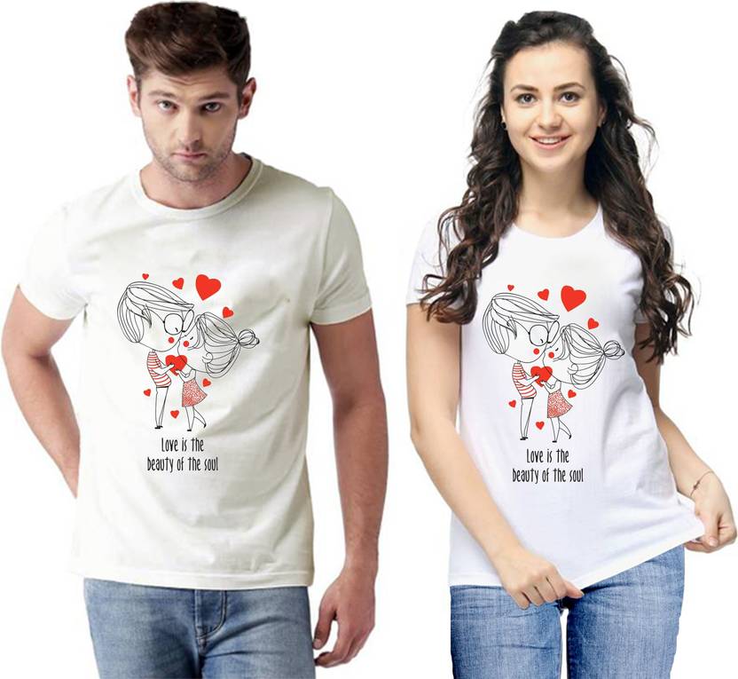 Pack of 2 Couple Printed Round Neck Cotton Blend White T-Shirt