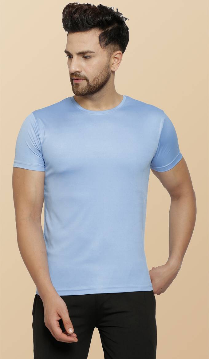 Men Solid Round Neck Polyester Light Blue T-Shirt