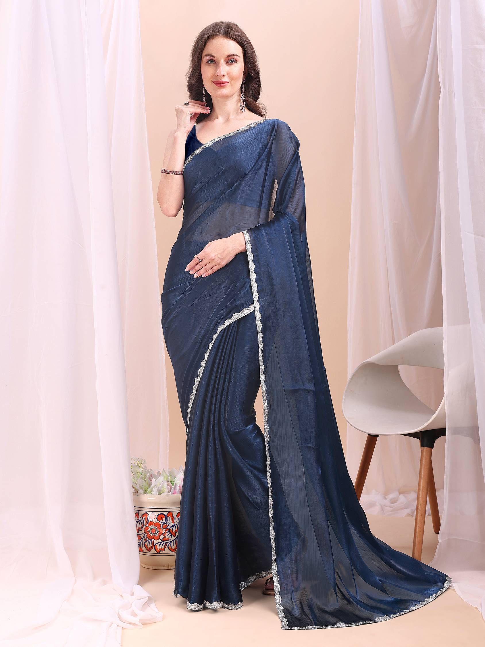 Elevate your ethnic wardrobe with this elegant saree, crafted from soft, lightweight fabric that drapes beautifully for a flattering silhouette. The saree features a shimmering sheen that adds a touch of glamour, while the silver scalloped lace border enhances its sophisticated appeal. Ideal for festive occasions, weddings, and evening parties, this saree is a timeless blend of simplicity and elegance. Pair it with statement jewelry and heels to complete your look.