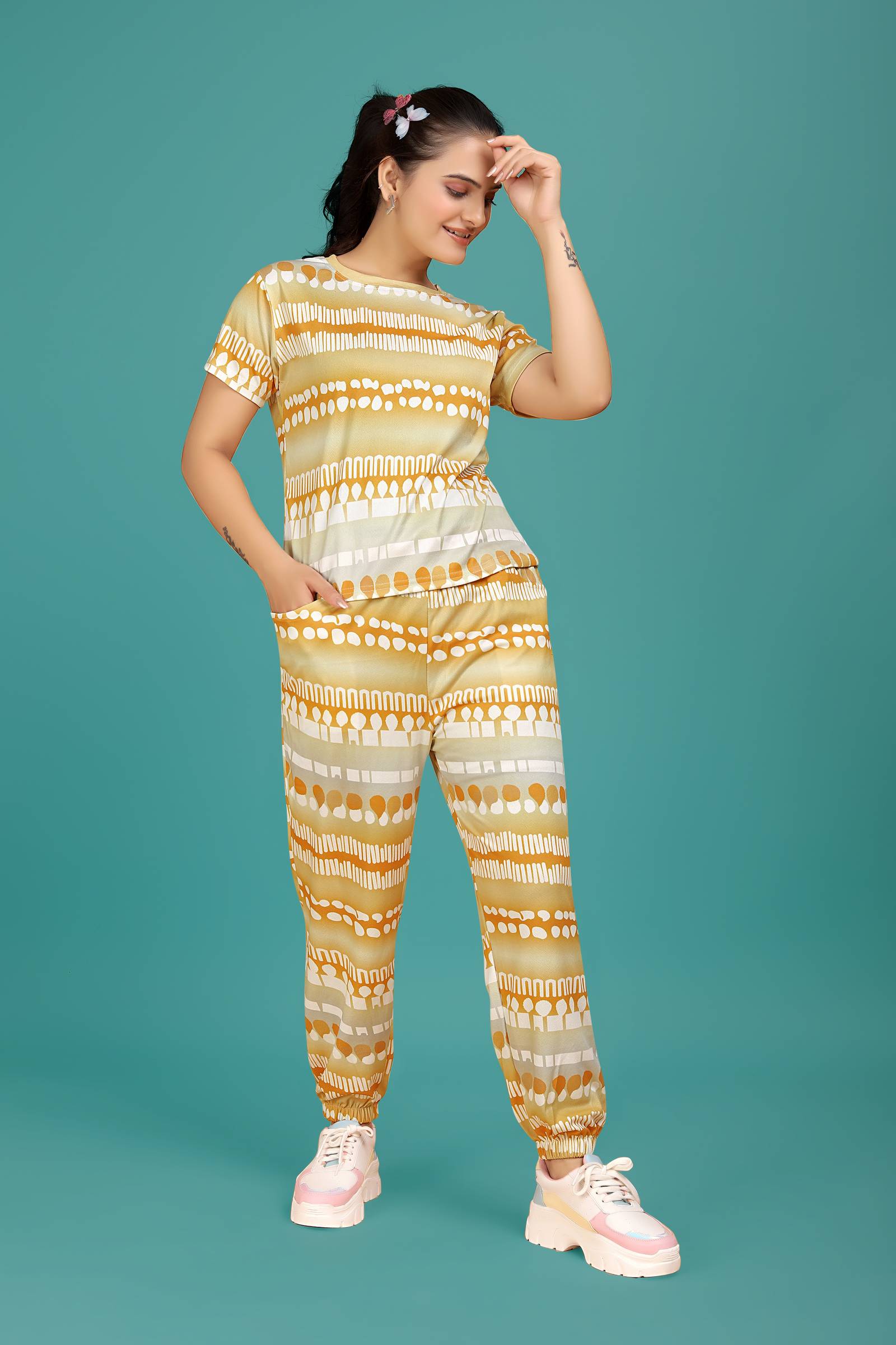 It sounds like this pair of Night Suits/Track Suits/Co ords/Night Dress/Gym Suits is made of Polyster Lycra hosiery fabrics and includes ankle-length bottoms with a fold, both side pockets, heavy stretch elasticated on both full sides, and a drawstring at the waist. This versatile pair can be used for a variety of activities such as sleeping, lounging at home, traveling, practicing yoga, working out at the gym, going out, or even as a coordinated outfit for parties.
