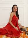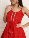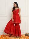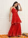 Women Red Bandhani Print Round Neck Front Slit Peplum Top and Flared Sharara Set with loop and tie-up detailing adorned with Gota and Lace at the hem.