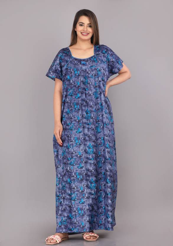 Free Size Comfort: With HARGUN NIGHT WEAR's Cotton Nightgown, which fits all body types for a tailored fit, you may embrace unrestricted comfort., Thoughtful pocket enhancements that are excellent for keeping necessities near by elevate convenience with their practical pocket design. This nightgown is a perfect example of how to blend style with practicality., flower Elegance: Add appealing purple flower designs, finely detailed for refinement, to your nighttime ensemble. Make a statement in this stylish sleepwear., Full-Length covering: Get warmth and cosiness with full-length covering, which permits unrestricted activity for an uninterrupted sleep.
