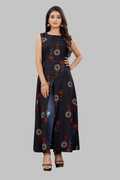 Fabric: Crepe Sleeve Length: Sleeveless Pattern: floral printed Sizes: S (Bust Size: 36 inch , Size Length: 51 inch ) M (Bust Size: 38 inch , Size Length: 51 inch ) L (Bust Size: 40 inch , Size Length: 51 inch ) XL (Bust Size: 42 inch , Size Length: 51 inch )XXL (Bust Size: 44 inch ,Size Length: 51 inch )