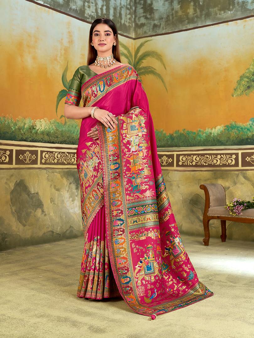 Explore The Collection Of Beautifully Designed Saree. Saree: Pink || Saree Work: Postion Print with Zari work || Saree Fabric: Viscose Silk | Blouse Fabric: Viscose Silk|| These Saree Are Perfect For Occasions And Events Anytime Of The Day Or Night.